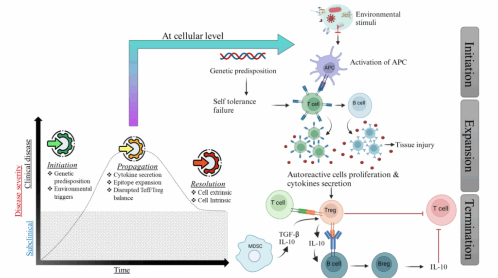 Les maladies auto-immunes évoluent en trois phases majeures. Lors de la phase d’initiation, une combinaison de facteurs environnementaux et de prédispositions génétiques entraîne une rupture de la tolérance immunitaire. Cette rupture provoque l’activation de cellules immunitaires autoréactives. Pendant la phase d’amplification, ces cellules amplifient la réponse immunitaire en libérant des cytokines et en attirant d’autres cellules immunitaires vers le site de l’inflammation. Cette phase peut devenir auto-entretenue, conduisant souvent à une inflammation chronique. La phase de résolution se caractérise par l’atténuation des réactions auto-immunes, grâce à l’activation de mécanismes inhibiteurs intrinsèques et extrinsèques aux cellules. Ces mécanismes agissent ensemble pour limiter la réponse effectrice et rétablir l’équilibre entre les cellules T effectrices (Teff) et les cellules T régulatrices (Treg).